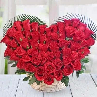 Heart Shape arrangement of Red Roses finished with a pretty Red Ribbon in a basket (Images provided on the website are for reference purposes)